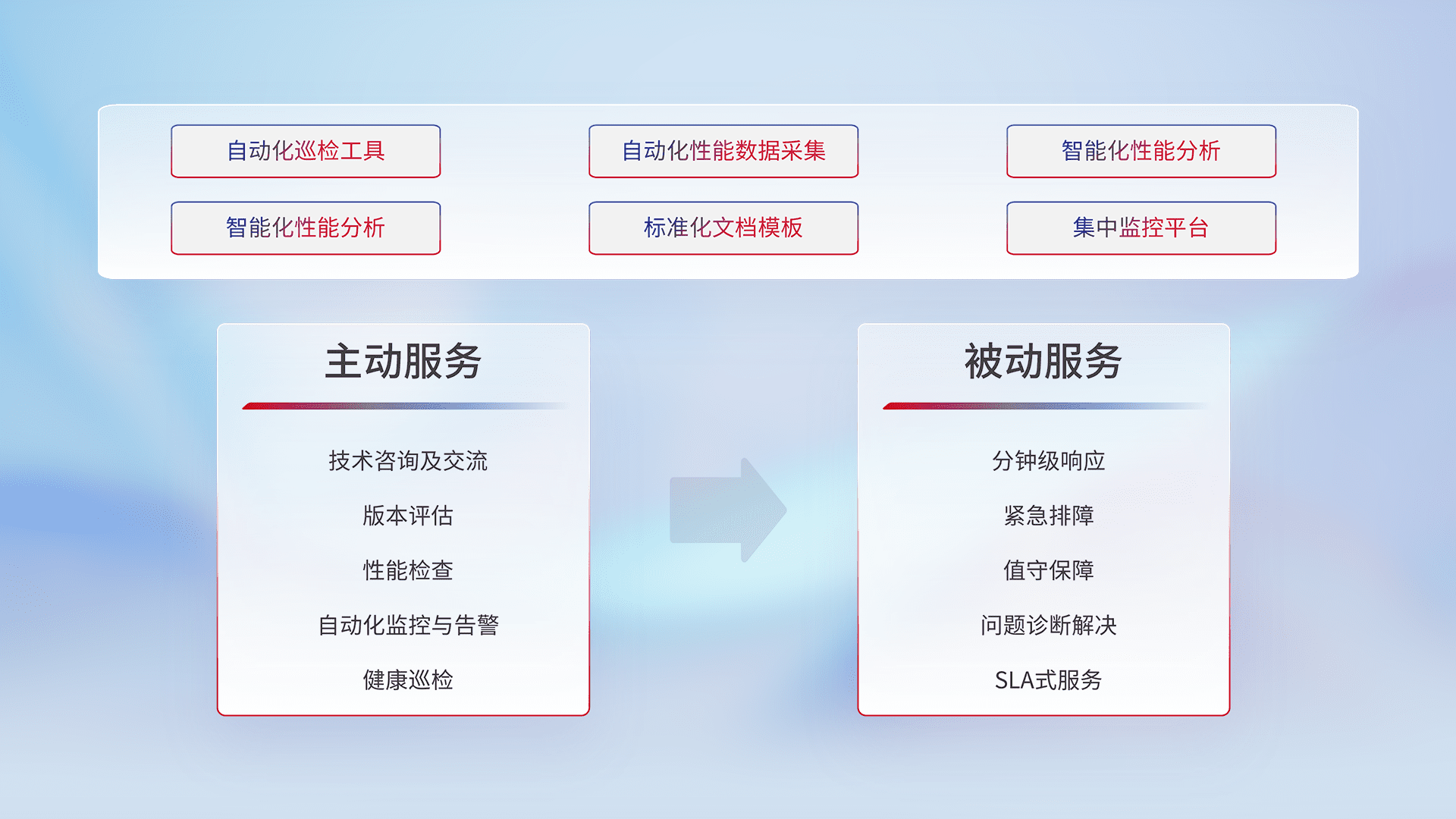 智能化工具和标准化文档,,,保障服务质量,,,,提供主动服务(包含技术咨询、、、、版本评估、、、、性能检查、、自动化监控与告警、、、健康巡检)和被动服务包含(分钟级响应、、、、紧急排障、、值守保障、、、、问题诊断解决、、SLA服务)。。。。
